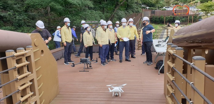 이번 집중안전점검에서는 점검 인력이 접근하기 어려운 명상구름다리 주탑 및 교각부에 드론을 투입하여 항공촬영과 입체투사기법(3D맵핑기술)을 활용하여 안전점검의 내실화와 실효성을 높였다.