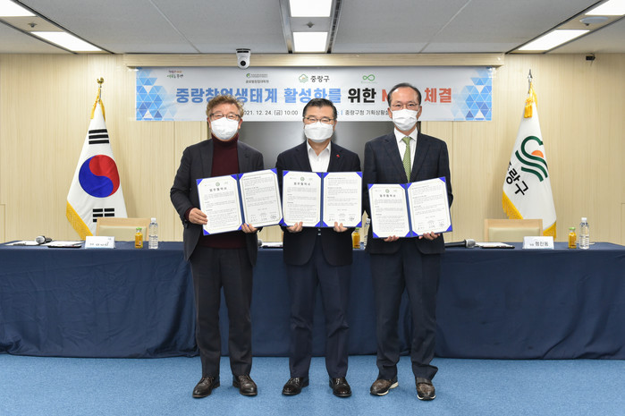 [시민일보 = 여영준 기자] 서울 중랑구(구청장 류경기)는 지난 24일 구청 기획상황실에서 성균관대학교 글로벌창업대학원 및 ㈜킹고스프링과 중랑창업생태계 활성화를 위한 업무 협약을 체결했다고 밝혔다.