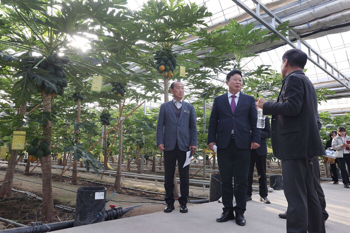 가평군 일행은 파파야·바나나 등을 생산하는 선우팜의 스마트팜 하우스 5개동을 둘러보고 재배기술, 시설 운영체계, 독자적인 종자·육묘 기술 등을 청취했다. 선우팜은 2020년 법인 설립 이후 2만6000여㎡ 부지에 1만3000여㎡ 규모의 스마트팜 시설을 구축해 파파야 1900주, 바나나 30주를 식재하고 연간 약 100톤을 생산하고 있다.