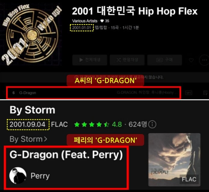 A씨가 자신의 곡이 무단으로 도용됐다고 주장하는 데에는 동명의 곡명이 원인이 됐다. 지디의 솔로공연 실황 앨범(2010년 )에 'G-DRAGON'이라는 곡이 '내 나이 열셋'이라는 제목으로 바뀌어 올라간 건 맞다. 이에대해 YG 측은 동명의 곡명으로 생긴 오해라고 해명했다. 실제로, 'G-DRAGON'이라는 제목의 곡은 2개가 있다. 하나는 A씨가 2001년에 작곡한 'G-DRAGON', 나머지 하나는 페리가 2001년에 만든 'G-DRAGON'(Feat. Perry)다.