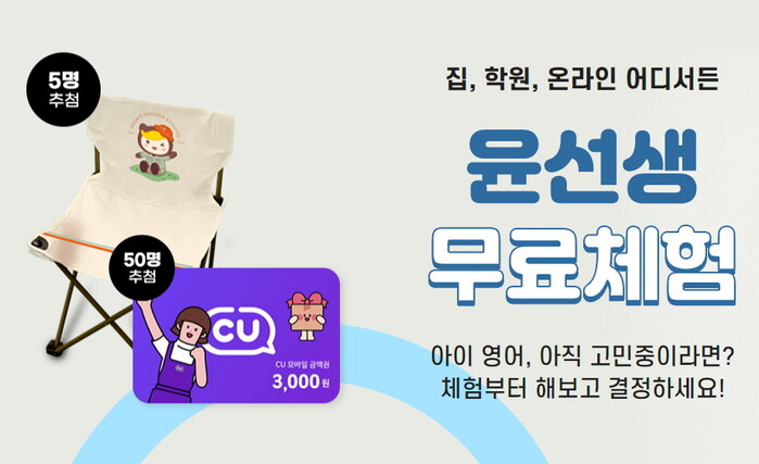 [시민일보 = 여영준 기자] 영어교육 전문기업 윤선생은 한정판 캠핑 의자를 경품으로 내걸고 무료 체험학습 이벤트를 실시한다고 9일 밝혔다.