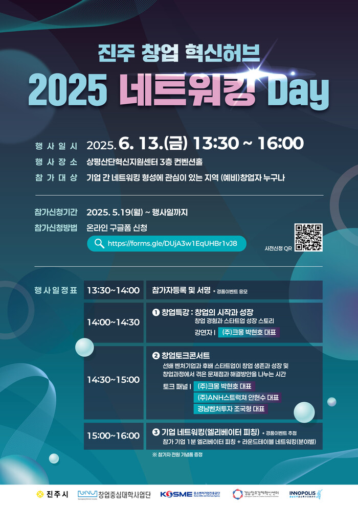 진주시는 지역 창업 생태계 활성화를 위한 대규모 교류 행사인「2025 네트워킹 Day」가 오는 6월 13일 오후 1시 30분 상평산단혁신지원센터 3층 컨벤션홀에서 개최된다고 밝혔다.