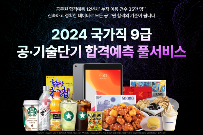 23일은 2024 국가직 9급 행정직과 기술직 공무원 시험이 진행되는 날로 시험이 종료된 직후부터 공단기와 기술단기 홈페이지에서 풀서비스를 이용할 수 있다. 풀서비스 이용자 중 추첨을 통해 ▲아이패드 ▲신세계 상품권 ▲스타벅스 아이스 아메리카노 ▲투썸플레이스 떠먹는 아이스박스 등 다양한 경품과 식음료 기프티콘을 선물로 제공한다.