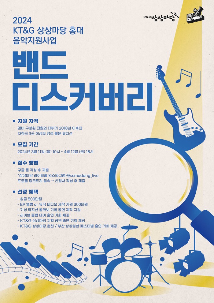 ‘2024 밴드 디스커버리’의 자세한 정보와 접수 방법은 오는 11일부터 KT&G 상상마당 홈페이지와 공식 인스타그램에서 확인할 수 있다.
