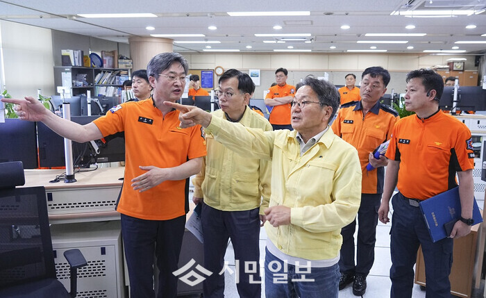 [광주=정찬남 기자] 강기정 광주광역시장이 21일 오전 시청 광주소방안전본부 119종합상황실을 찾아 호우 대처 상황을 점검하고 시민안전을 위해 최선을 다 해 주길 당부하고 있다./광주광역시 제공