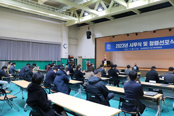 [남악=황승순 기자]전라남도체육회(회장직무대행 최기동)는 2023년 시무식 및 청렴선포식을 갖고 계묘년 새해 새로운 각오를 다졌다.