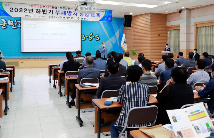 [보성=황승순 기자] 보성군은 지난 14일 군청 4층 대회의실에서 청렴한 조직문화 조성을 위해 6급 이상 공직자, 승진자, 신규자 등 200여명을 대상으로 ‘2022년 부패방지 청렴교육’을 실시했다.