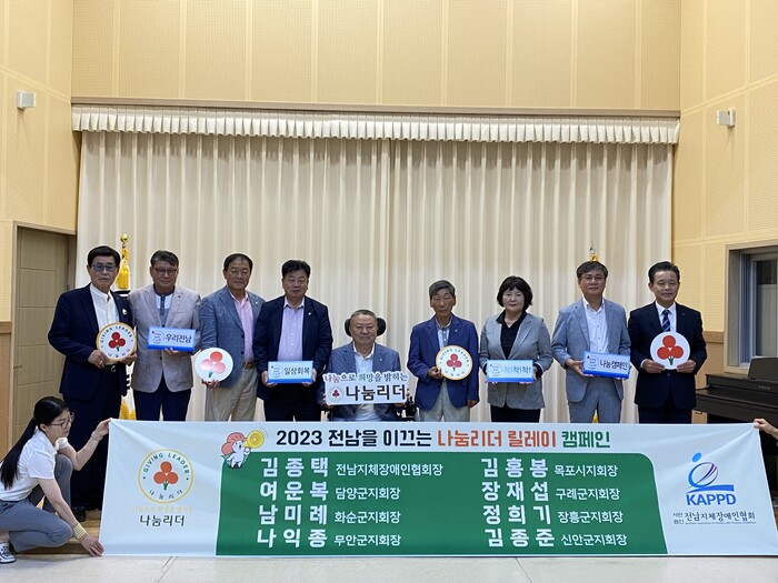 이번 진행된‘나눔리더 릴레이 캠페인’에는 전라남도지체장애인협회 김종택 협회장, 목포시지회 김홍봉지회장, 담양군지회 여운복지회장, 구례군지회 장재섭지회장, 화순군지회 남미례지회장, 장흥군지회 정희기지회장, 무안군지회 나익종지회장, 신안군지회 김종준지회장이 지역사회 나눔확산을 위해 약정서에 서명했다.
