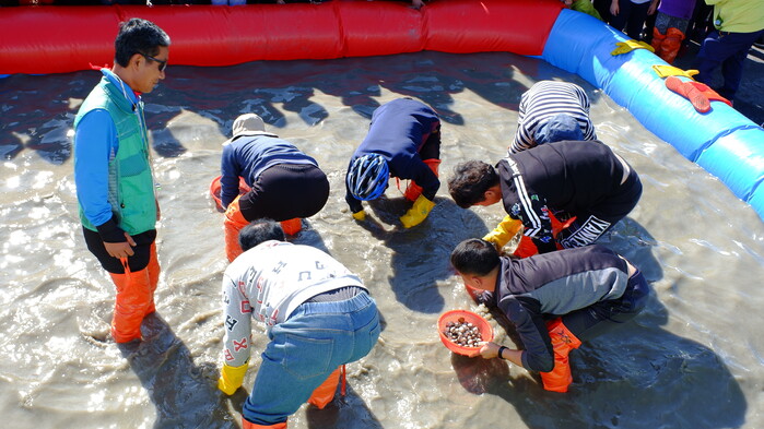 | ▲ '황금꼬막을 찾아라' 부대프로그램에서 관광객이 황금 꼬막을 찾고 있다. (2018년 제17회 벌교꼬막축제) |