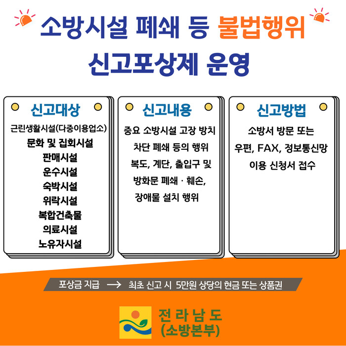 [신안=황승순 기자]신안소방서(서장 류고형)는 소방시설 등 불법행위 신고포상제에 대해 집중 홍보한다고 5일 밝혔다.