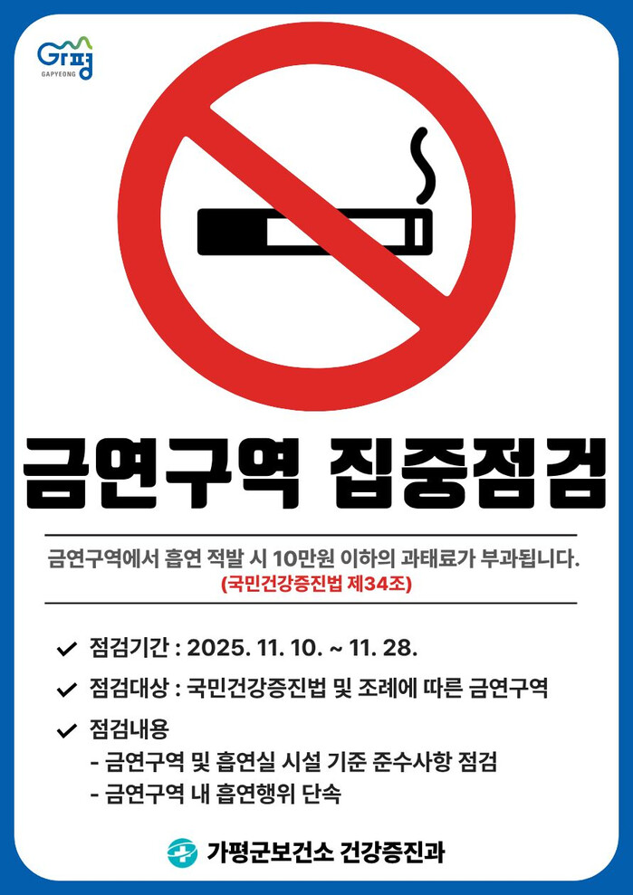 [가평=최광대 기자] 가평군보건소는 11월 10일부터 28일까지 ‘국민건강증진법’ 및 관련 조례에 따라 관내 금연구역에 대한 집중 점검을 실시한다.