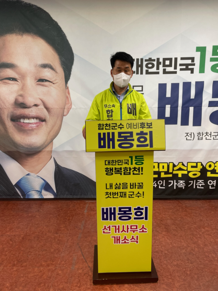 개소식에서 배몽희 예비후보는 “이번 합천군수선거는 합천군민의 자존심을 회복하는 선거입니다. 차기 군수는 다시는 합천군민의 명예를 실추시켜서는 안되는 중요한 선거가 되어야 한다”며 강조했고, 이번 선거를 통해 “합천군민수당 1인당 연 100만원 지급으로 인구소멸의 위기를 막고 지역경제를 활성화 하며 마침내 대한민국 1등 행복합천을 꼭 만들고 싶다”고 전했다.