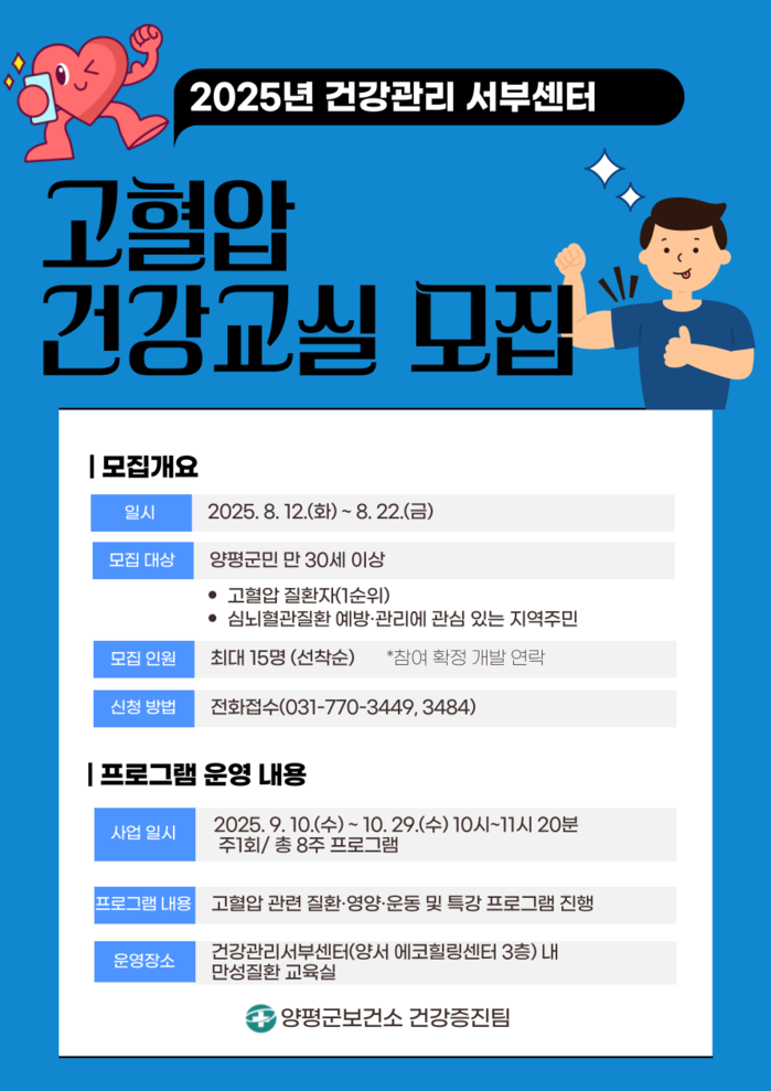오는 8월 12일(화)부터 8월 22일(금)까지 11일간 모집을 진행하며, 양평군민 만 30세 이상을 대상으로 선착순 15명을 선발한다. 특히 고혈압 질환자를 1순위로 우선 선발하되, 심뇌혈관질환 예방과 관리에 관심이 있는 지역주민이면 누구나 참여할 수 있다.