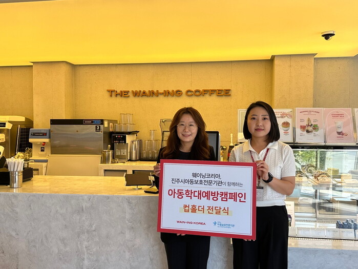 진주시아동보호전문기관(관장 김혜진)은 20일 ㈜웨이닝코리아 진주경상대점에서 아동학대예방 캠페인을 위한 ‘컵홀더 전달식’을 가졌다.