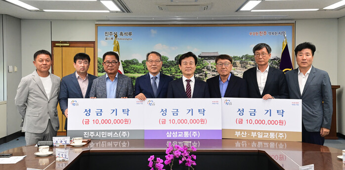 20일 부산교통·부일교통·삼성교통·진주시민버스 등 4개 시내버스 업체 대표들이 진주시를 방문, 취약계층 지원 및 지역 발전을 위해 써달라며 조규일 진주시장에게 3000만 원 성금기탁증서를 전달했다.