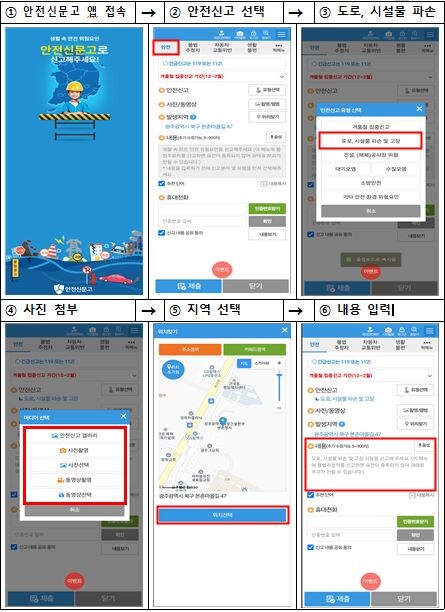 | ▲ 안전신문고 활용 '포트홀' 신고방법 이미지 / 광주광역시 제공 |