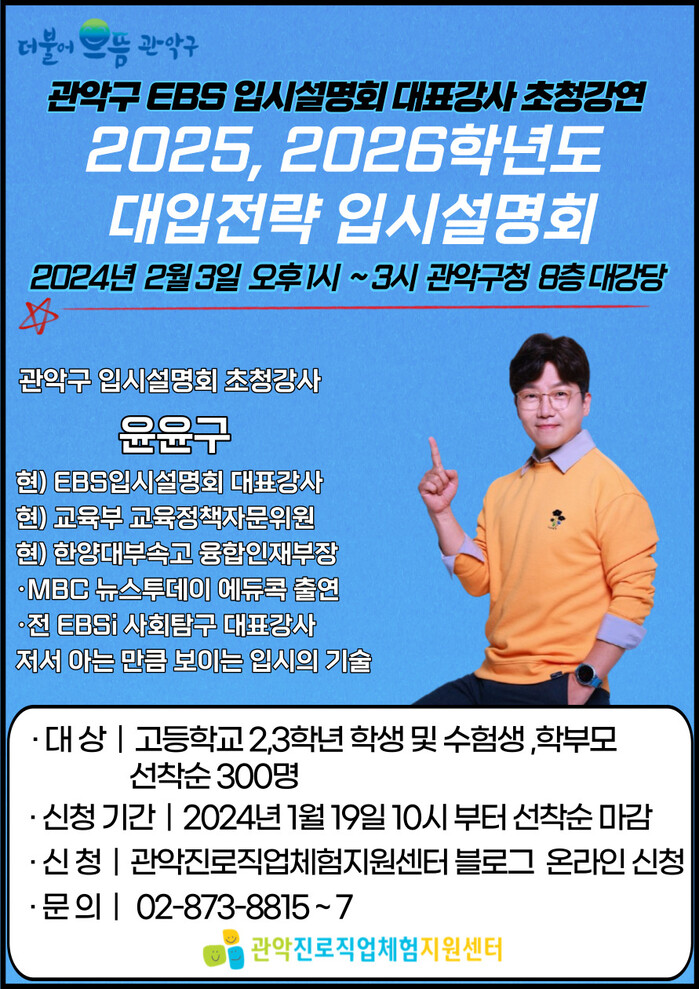 특히 윤윤구 선생님은 교육부의 교육정책 자문 위원으로도 활동하고 있는 만큼 이번 강의를 통해 관악구 학생과 학부모님의 성공적인 대입 전략 수립을 든든히 지원할 예정이다.