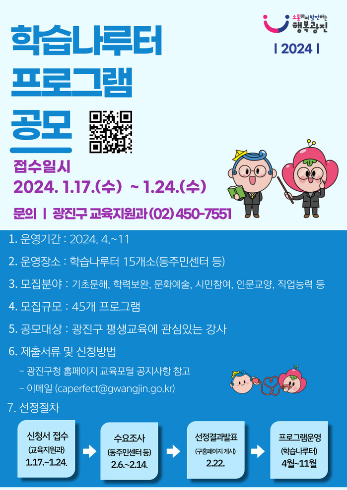 [시민일보 = 여영준 기자] 서울 광진구(구청장 김경호)가 구민의 평생학습 요구를 반영한 교육 운영을 위해 오는 24일까지 ‘학습나루터’ 프로그램 공모를 진행한다.