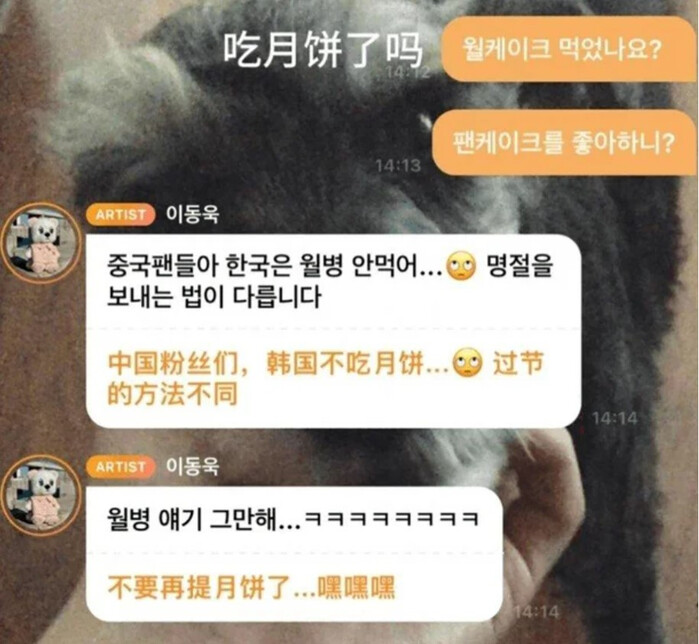 최근 중국 사회관계망서비스(SNS) 웨이보에는 ‘이동욱, 한국은 월병을 안먹어요’ 태그가 실시간 토론에 오르며 갑론을박이 확산되고 있다.