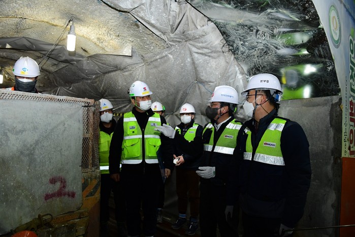 | ▲ 전력구 점검을 하고 있는 한전 정승일 사장(오른쪽에서 두번째)의 모습.(사진제공=한전) |