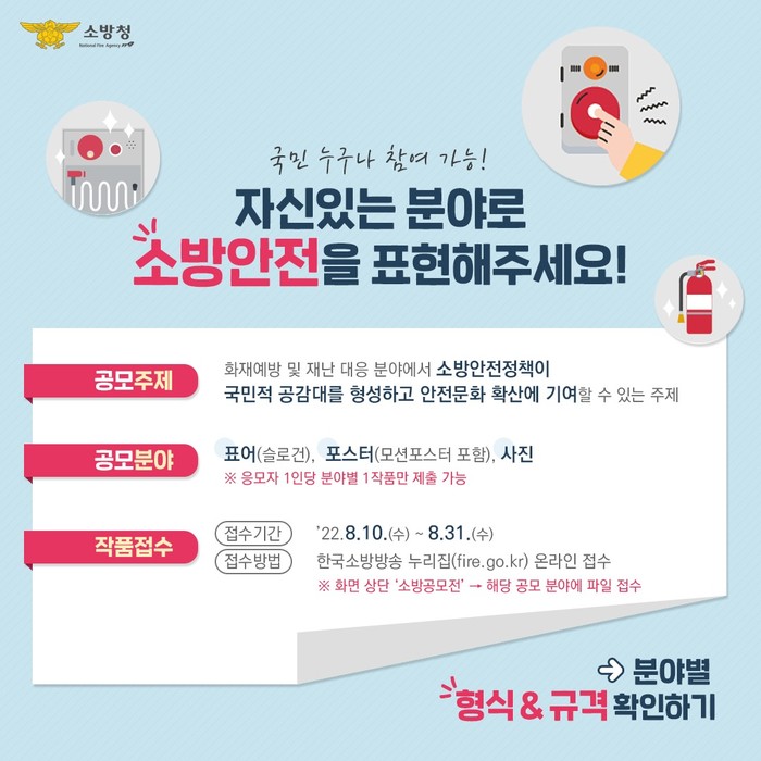 공모전은 8월 10일부터 31일까지 한국 소방 방송 누리집 에서 온라인으로 접수할 수 있다. 출품 된 작품은 1차ㆍ2차 심사 과정을 거친 뒤 9월 30일 소방청ㆍ한국소방안전원 누리 집을 통해 당선 작이 발표될 예정이다.