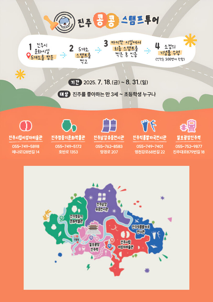 진주시는 여름방학을 맞은 어린이들을 대상으로 7월 18일부터 8월 31일까지 진주의 대표 문화 시설을 탐방하는 어린이 스탬프 투어 ‘진주 콩콩 투어’를 운영한다.