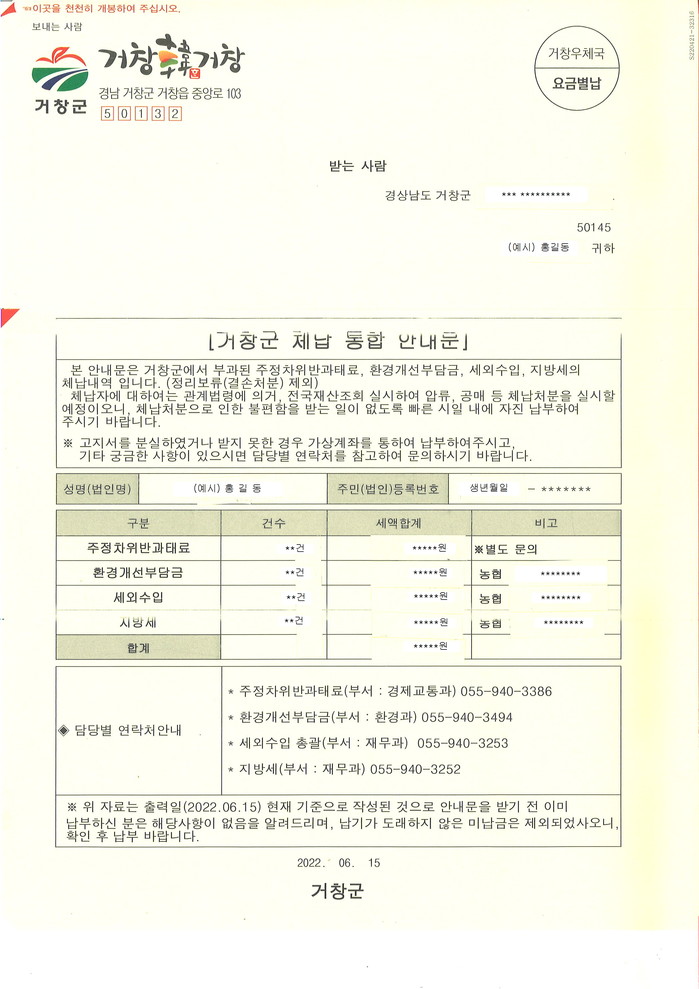 거창군은 지방세, 세외수입 등 개인별 체납내역을 한 장으로 받아볼 수 있는 ‘거창군 체납통합 안내문’을 발송했다.