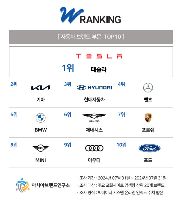 W랭킹 자동차 부문은 테슬라가 1위를 차지한 가운데 기아(2위), 현대자동차(3위), 벤츠(4위), BMW(5위), 제네시스(6위), 포르쉐(7위), MINI(8위), 아우디(9위), 포드(10위) 등이 상위권에 이름을 올렸다.