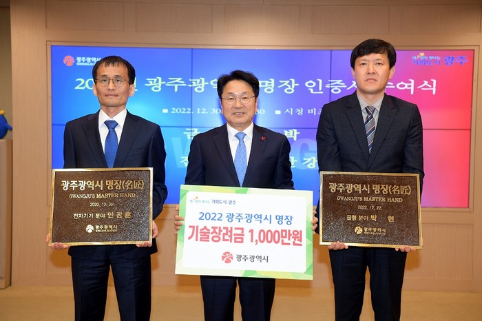 [광주=정찬남 기자] 광주광역시(시장 강기정)는 박현 태경㈜ 대표와 안강훈 ㈜샤론테크 부장을 광주시 명장으로 선정하고 30일 오후 시청에서 증서와 현판을 수여했다.