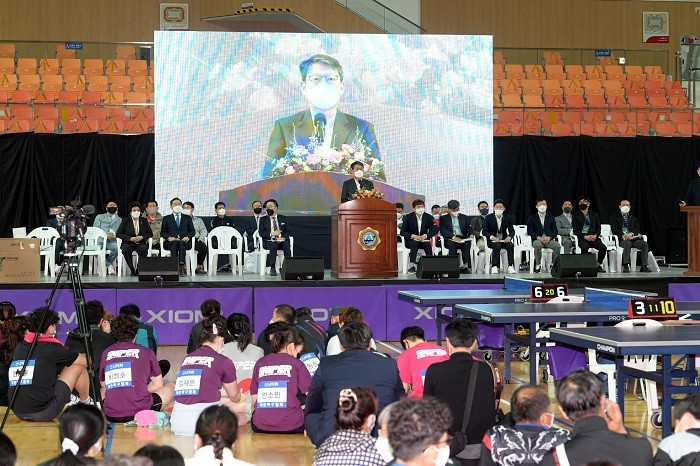 [광주=정찬남 기자] 조인철 광주광역시 문화경제부시장이 9일 오전 광주여자대학교 유니버시아드체육관에서 열린 제28회 대한탁구협회장기 생활체육 전국 탁구대회 개회식에 참석해 축사를 하고 있다. /광주광역시 제공