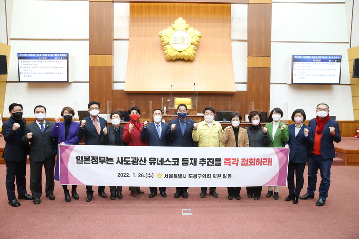 | ▲ '일본정부 사도광산 유네스코 세계문화유산 등재 추진 규탄 결의안'을 채택한 도봉구의원들이 기념촬영을 하고 있다.(사진제공=도봉구의회) |