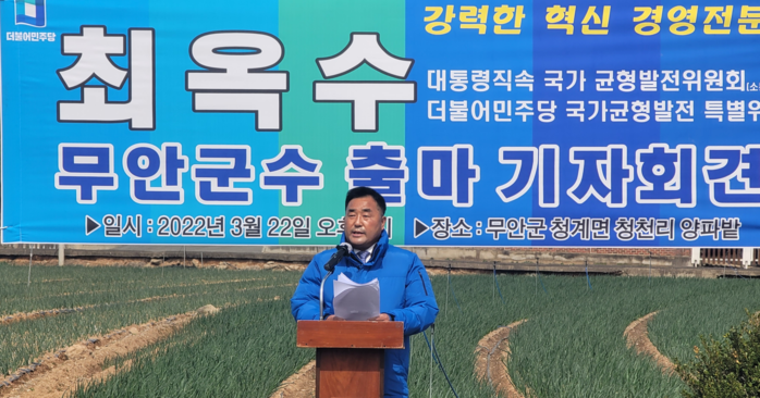 최옥수(58·사진) 전 무안군산림조합장이 6·1 지방선거 무안군수 출마를 공식 선언했다. 최 전 조합장은 22일 오후 2시 무안군 청계면 양파밭 현장에서 기자회견을 갖고 무안군 혁신 발전 구상과 포부를 밝혔다.
