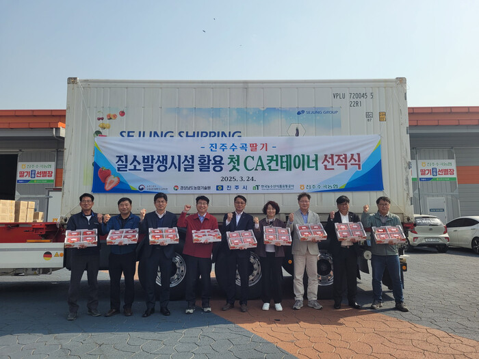 진주시는 24일 진주수곡농협수출농단 선별장에서 CA(Controlled Atmosphere) 컨테이너를 활용한 금실딸기 첫 선박 수출 선적식을 가졌다.