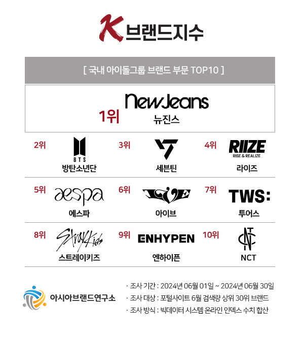 K-브랜드지수 아이돌그룹 부문은 뉴진스가 1위의 영예를 차지한 가운데 방탄소년단(2위), 세븐틴(3위), 라이즈(4위), 에스파(5위), 아이브(6위), 투어스(7위), 스트레이키즈(8위), 엔하이픈(9위), NCT(10위) 등이 TOP10에 이름을 올렸다.
