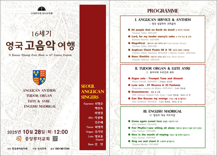 한국루터란아워 김선영 디렉터는 “이번 공연은 ‘16세기 영국 고음악 여행이라는 주제로 펼쳐지며, 16–17세기 영국의 교회음악과 튜더 시대의 세속음악을 한 자리에서 만날 수 있는 특별한 무대다. 영국 교회의 전통과 신앙이 깃든 노래들, 기도와 음악이 어우러지는 정오의 시간으로 초대한다”고 밝혔다.