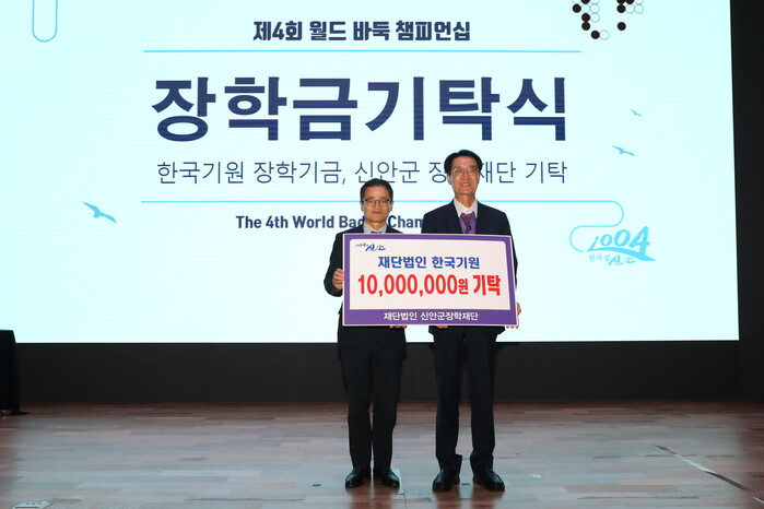 [신안=황승순 기자]지난 20일 제4회 월드 바둑 챔피언십 선수단 환영식장(자은 라마다 리조트)을 방문한 양재호 한국기원 사무총장은 신안군 인재 육성을 위해 사용해 달라며 신안군장학재단(이사장 박우량)에 1천만 원의 장학기금을 전달했다.