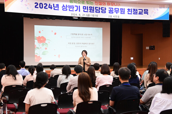외부 전문강사를 초빙해 진행된 이번 교육은 ‘친절을 위한 마음 챙김’을 주제로 친절을 위한 언어와 태도, 우리 사회의 친절 개념에 대한 인식 점검, 언어의 온도를 높이는 작은 변화와 마음 챙김 등 교육 참가 공무원들과 직접 소통하고 생각을 나누는 방식으로 실시됐다.
