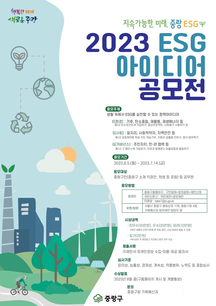 [시민일보 = 여영준 기자] 서울 중랑구(구청장 류경기)가 오는 7월14일까지 ‘지속가능한 미래, 중랑 ESG’를 만들어 가기 위한 ‘2023 ESG 아이디어 공모전’을 개최한다.