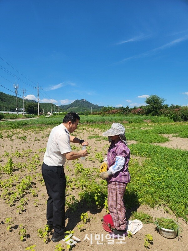 | ▲ 정용인 강진소방서장, 29일 밭에서 농작업 지역 주민에 생수를 전달하며 폭염 주의 당부 / 강진소방서 제공 |