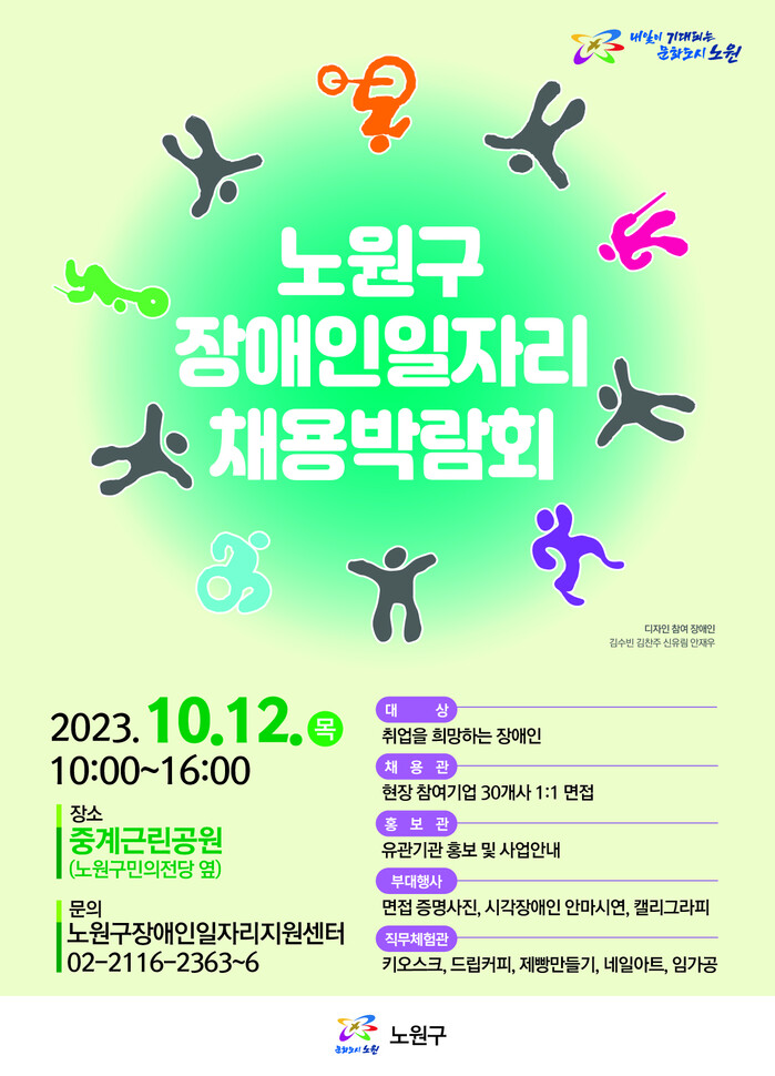 [시민일보 = 홍덕표 기자] 서울 노원구(구청장 오승록)가 오는 12일 중계역 인근 중계근린공원에서 '2023 노원구 장애인 일자리 채용 박람회'를 개최한다.