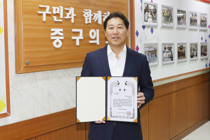 | ▲ 길기영 서울 중구의회 의장이 상장을 들고 기념촬영을 하고 있다. |