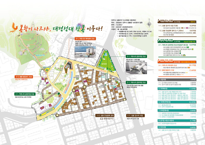 사업 대상지인 상봉지구는 서봉지공원 일원 약 7만 4000㎡이다. 진주시는 봉황 설화가 얽힌 역사 자원을 활용한 ‘봉황이 나르샤, 태평성대 상봉 이루다!’라는 비전을 수립하고 노후주택 및 골목길 정비, 빈집 정비, 문화 및 생활서비스 지원 등 주거환경 개선에 초점을 맞춰 사업을 진행할 예정이다.