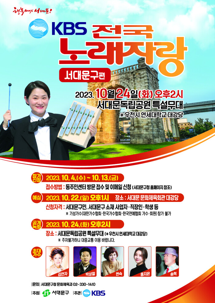 [시민일보 = 홍덕표 기자] 서울 서대문구(구청장 이성헌)가 오는 24일 오후 2시 서대문독립공원 특설무대에서 국내 최장수 예능프로그램 KBS 전국노래자랑을 개최한다.
