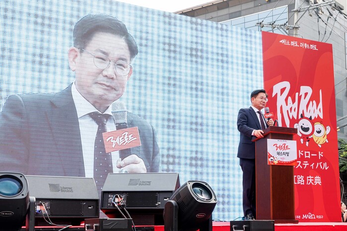 | ▲ 지난 5월 열린 레드로드 페스티벌 개막식에서 인사하는 박강수 구청장. (사진=마포구청 제공) |