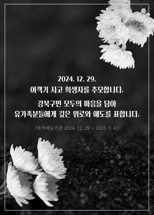 한편, 구는 30일 비상대책회의를 열고 희생자들을 추모하기 위해 1월 1일 북서울꿈의숲 청운답원에서 예정됐던 ‘2025년 을사년 강북 해맞이 행사’ 등 모든 지역 행사를 전면 취소하기로 결정했다. 또한 국가애도기간동안 조기를 게양하고 전 직원들이 근조 리본을 패용하는 등 추모에 동참하고 있다.