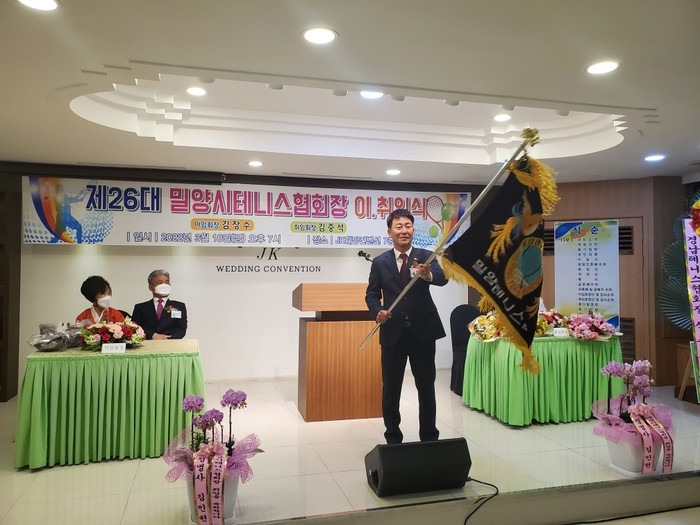 | ▲ 지난 18일 JK웨딩컨벤션에서 개최된 제26대 밀양시테니스협회 협회장 이·취임식에서 김중석 신임회장이 협회기를 흔들고 있다. |