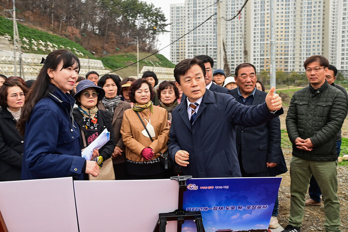 조규일 진주시장은 25일 ‘말티고개~장재 도로’ 개통 현장을 찾아 도로와 교통 안전시설 등을 점검하고 공사 관계자들을 격려했다.