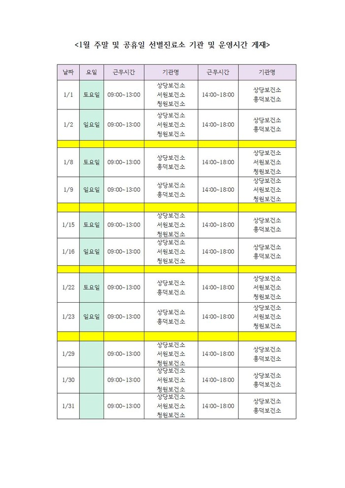 상당보건소 선별진료소 신속항원검사는 오전 9시부터 오후 6시까지 운영되며, 오후 1시부터 오후 2시까지는 점심시간으로 잠시 운영이 중단된다. 단 주말 및 설 연휴기간에는 4개 보건소의 선별진료소 운영시간이 다르니 청주시청 홈페이지(공지사항)를 통해 확인 후 이용해야 한다.