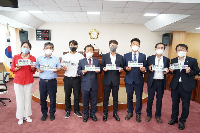 제9대 강화군의회 의원 7명이 전원이 ‘장기기증 희망등록’에 동참했다. 사진은 ‘아임도너 챌린지’ 피켓을 들고 있는 강화군의원들의 모습.(사진제공=강화군의회)