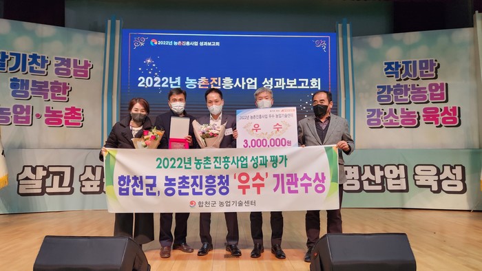 합천군은 경남의 18개 시군 중 도원에서 추천한 3개 시군에 포함되어 기술보급사업 종합 만족도 등 9개의 지표 중 8개의 정량평가와 1개의 정성평가 점수를 합산한 평가에서 우수한 성적을 거두어 우수 기관 선정의 기쁨을 누렸다.
